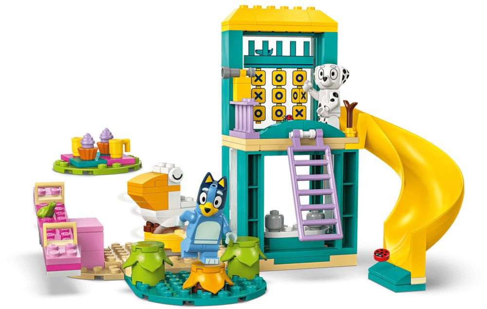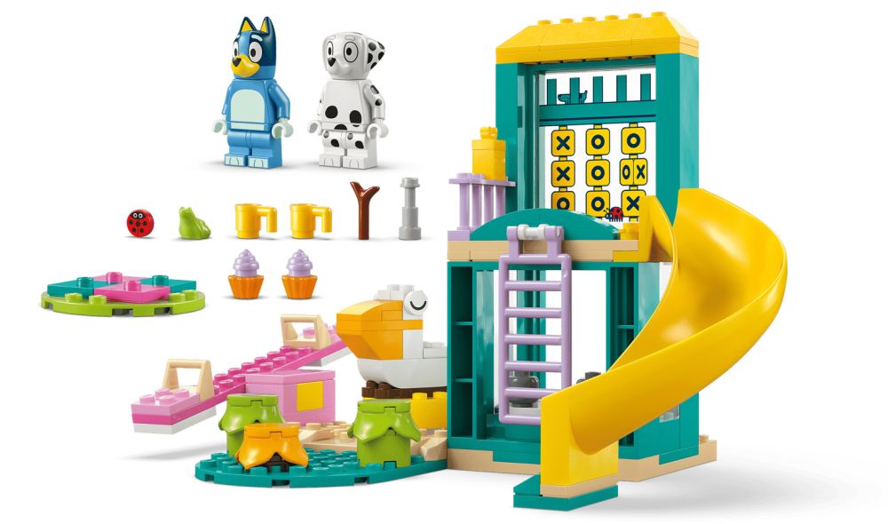 Ce jouet polyvalent inclut les minifigurines des chiens Bluey et Chloe de la célèbre série TV, ainsi qu’une aire de jeux aux couleurs vives avec une balançoire, un toboggan, une cage à écureuil, un tourniquet pélican, 3 plantes sur lesquelles les personnages peuvent sauter, une tour avec un télescope et une aire de pique-nique avec des boissons et des gâteaux. La boîte contient un sachet pour chaque modèle à construire, ainsi qu’une grande brique de démarrage et des instructions simples, intuitives et colorées qui rendent la construction rapide et amusante.