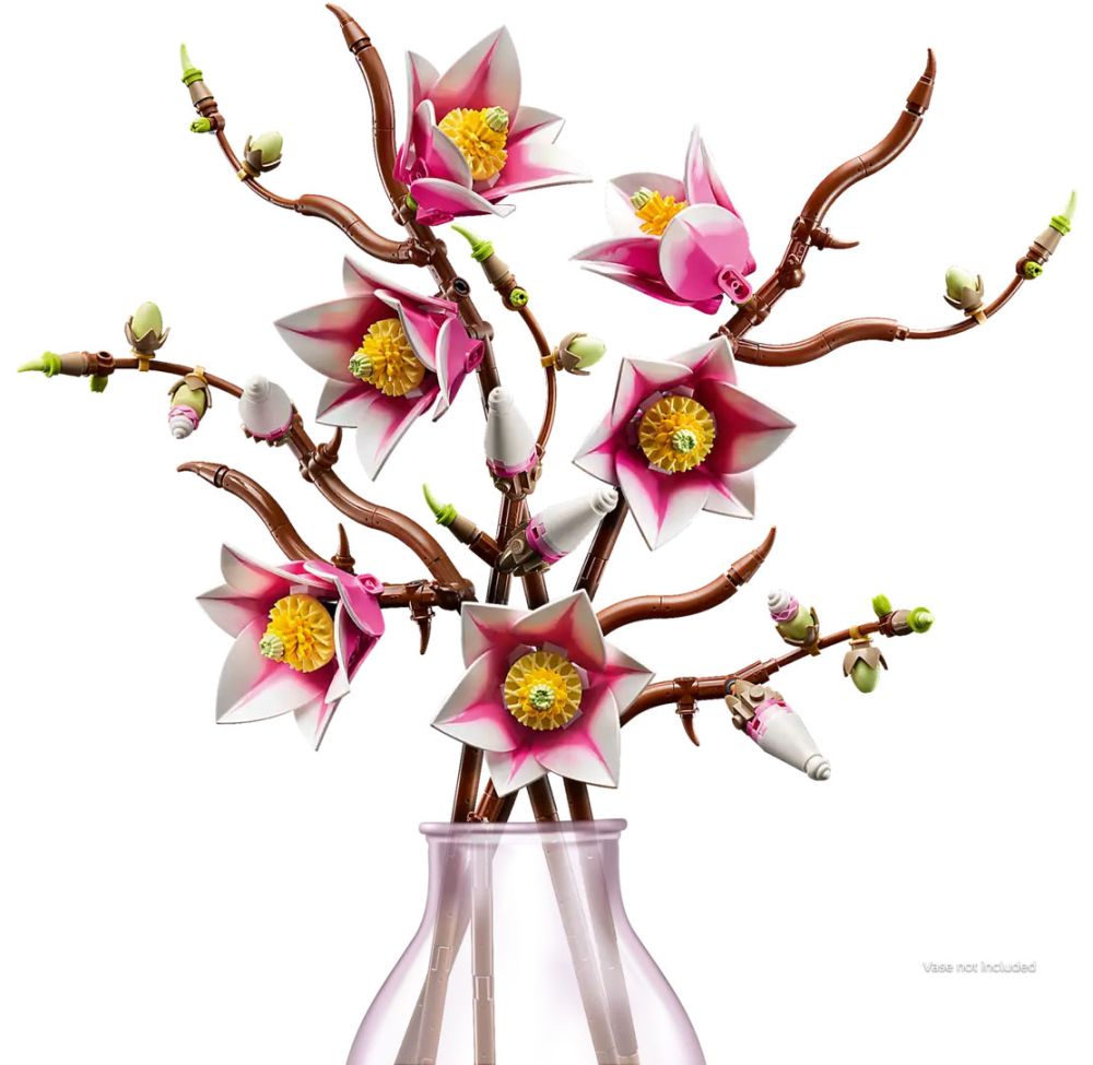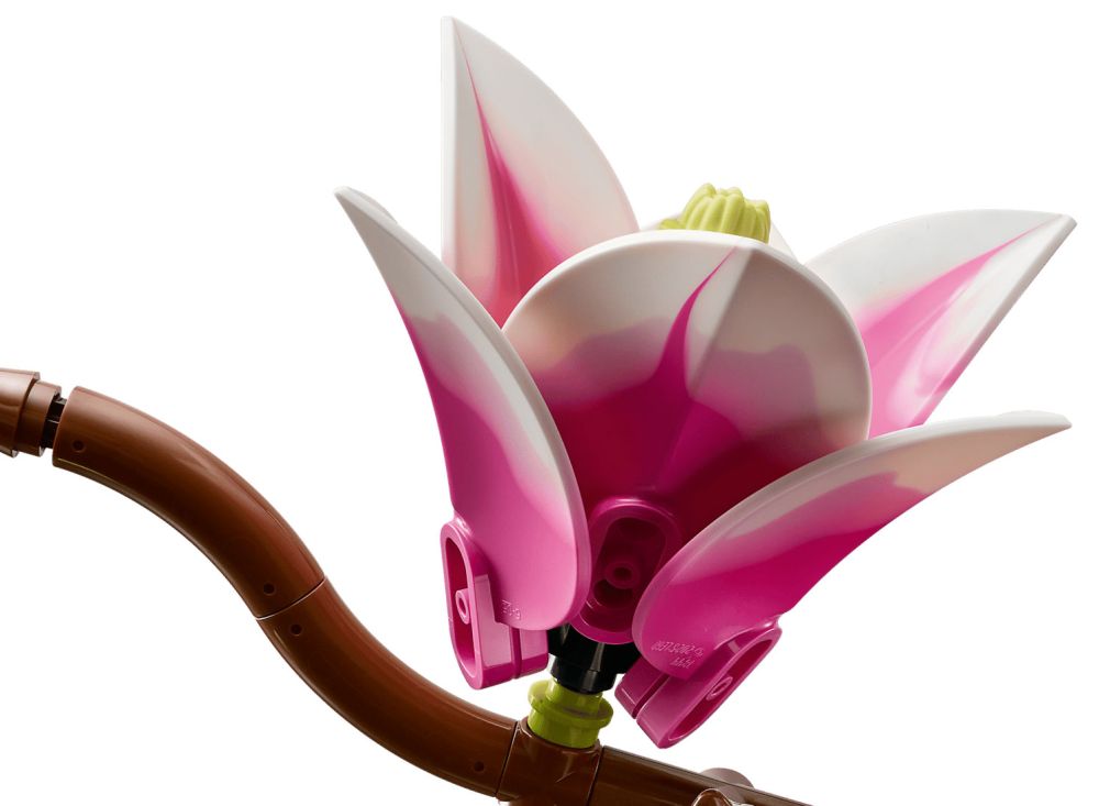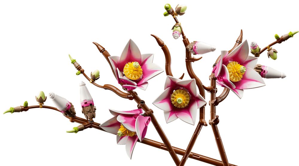 - MAGNOLIAS LEGO – Ce kit de construction inclut 5 branches de magnolia, dont 2 montrent tout le cycle de développement de la fleur, du petit bourgeon aux pétales épanouis