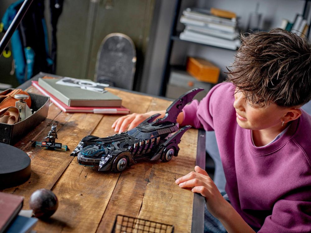 Cette réplique authentique de la voiture du film Batman Forever est dotée d’un pare-brise moulé, de roues mobiles, de décorations et d’un cockpit qui s’ouvre pour révéler un intérieur détaillé. Le véhicule s’accompagne d’une minifigurine de Batman à présenter sur son propre support. Pour ajouter une dimension numérique à cette expérience, les constructeurs peuvent zoomer, faire pivoter les modèles en 3D et suivre leur progression avec l’application LEGO Builder intuitive. Contient 909 pièces.