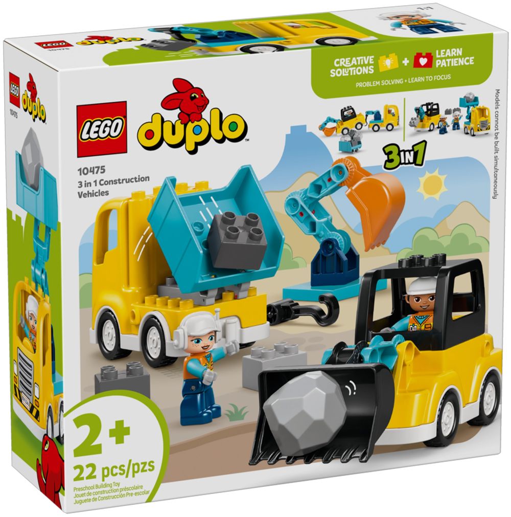 - JOUETS DE CONSTRUCTION POUR TOUT–PETITS – Stimulez la créativité des jeunes enfants avec Les véhicules de chantier 3-en-1 LEGO DUPLO Ma ville (10475), dont les 22 briques s'assemblent pour créer 6 options de véhicules de chantier