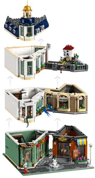 Le bâtiment de 3 étages abrite un magasin de musique sur 2 niveaux avec des instruments et un magasin de meubles avec un comptoir, des tabourets, une table et un atelier. À l’étage supérieur se trouve un appartement meublé avec salle de bain, et sur le toit, un jardin accueille des plantes et un pigeonnier. Superbe décoration d’intérieur, ce modèle au design modulaire inclut 7 minifigurines et offre un accès facile à l’intérieur.