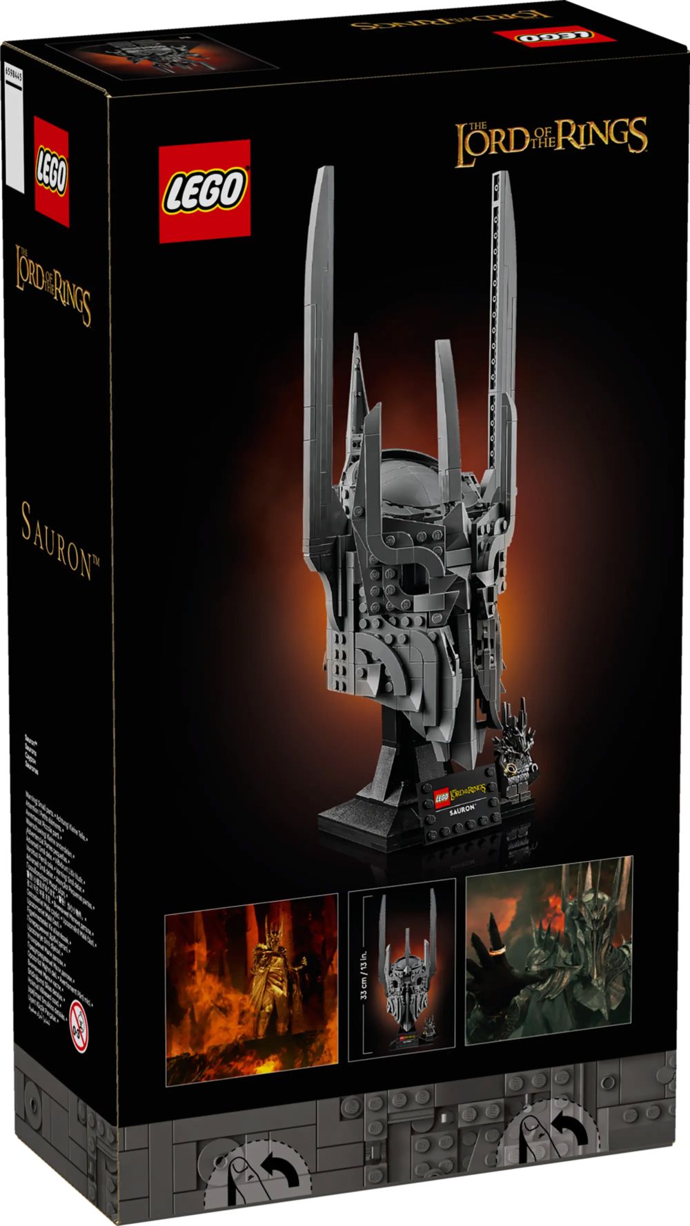 - DIMENSIONS – La maquette du set Le Seigneur des Anneaux : le casque de Sauron LEGO Icons de 538 pièces mesure plus de 33 cm de haut, 13 cm de large et 13 cm de profondeur