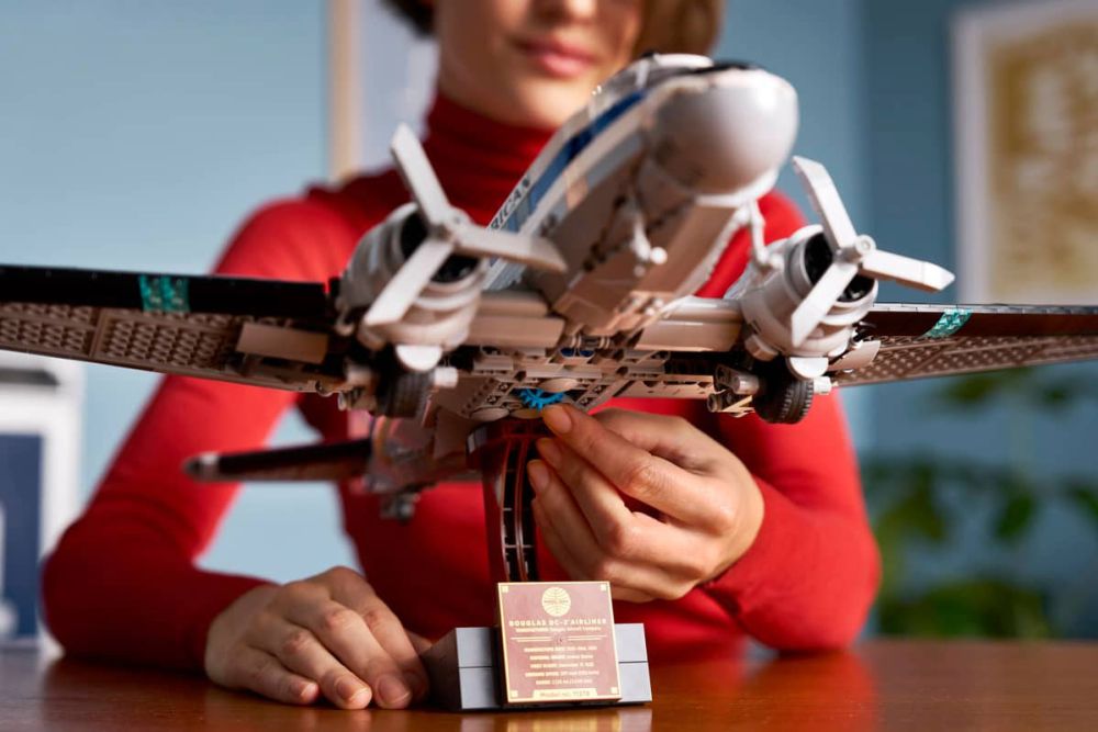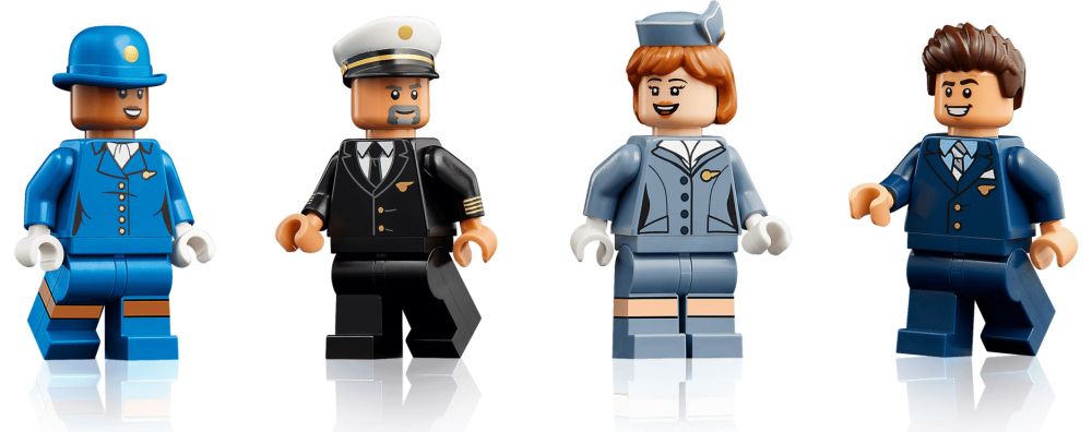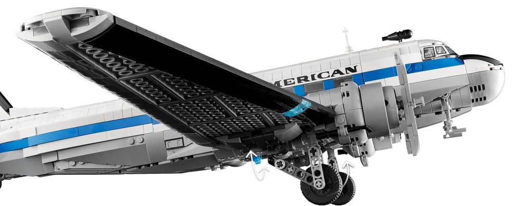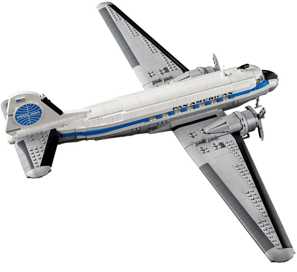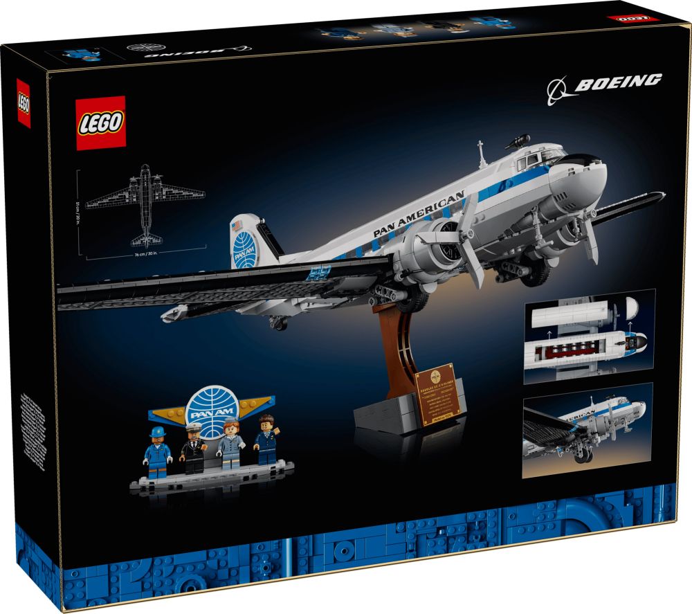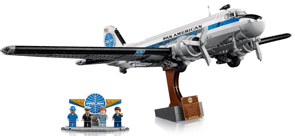 - DÉCOR VINTAGE – La maquette du DC-3 inclut un support avec plaque descriptive, ainsi qu'un présentoir à construire avec le logo de la Pan Am pour exposer les minifigurines : pilote, agent de bord, hôtesse de l'air et chef de cabine