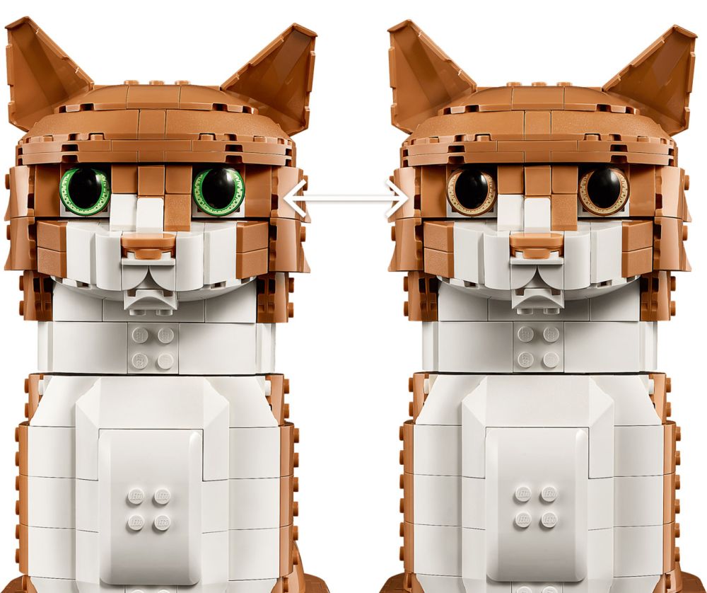 - COLLECTIONNEZ LES CHATS – Le chat bicolore noir et blanc LEGO Ideas (21349, vendu séparément) et ce chat roux s’entendront à merveille. Les yeux compatibles avec les deux modèles peuvent être interchangés