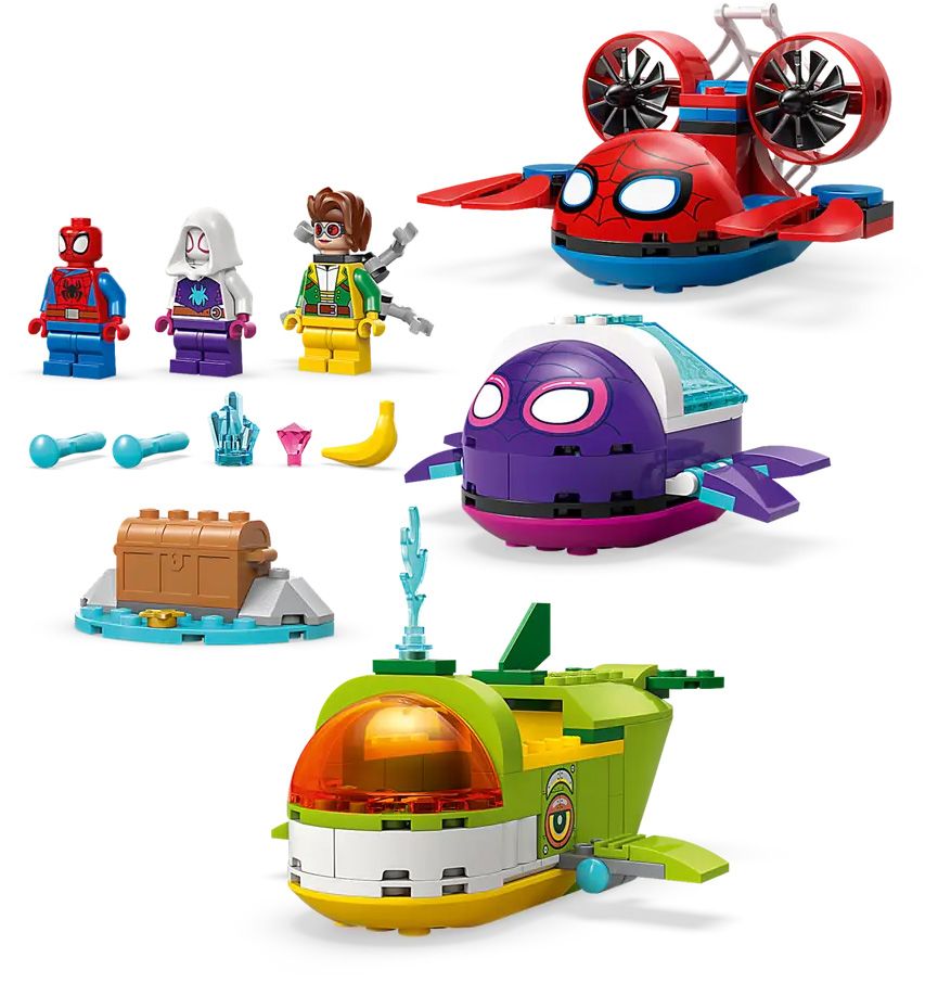 - SUPER-HÉROS CONTRE MÉCHANT – Le sous-marin crabe de Spidey est doté d’une toile d’araignée géante, le sous-marin tortue de Ghost-Spider d’une carapace transparente qui s'ouvre et le sous-marin baleine de Docteur Octopus de fusils sur les nageoires