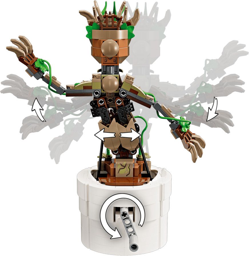 Le jouet de construction Groot peut bouger la tête et les bras. Lorsque les enfants tournent la poignée à l’arrière du pot de fleurs, la figurine articulée commence à danser. Ils peuvent la personnaliser en ajoutant avec des feuilles, un casque à construire et des lunettes de soleil, et décorer le pot en ajoutant l’une des 3 plaques nominatives (dont une rappelant la série TV Je s'appelle Groot). Tous ces accessoires peuvent être rangés dans le compartiment intégré au pot. Pour une expérience encore plus amusante, l’application LEGO Builder permet aux enfants de zoomer, de faire pivoter les modèles en 3D et de suivre leur progression au fur et à mesure.