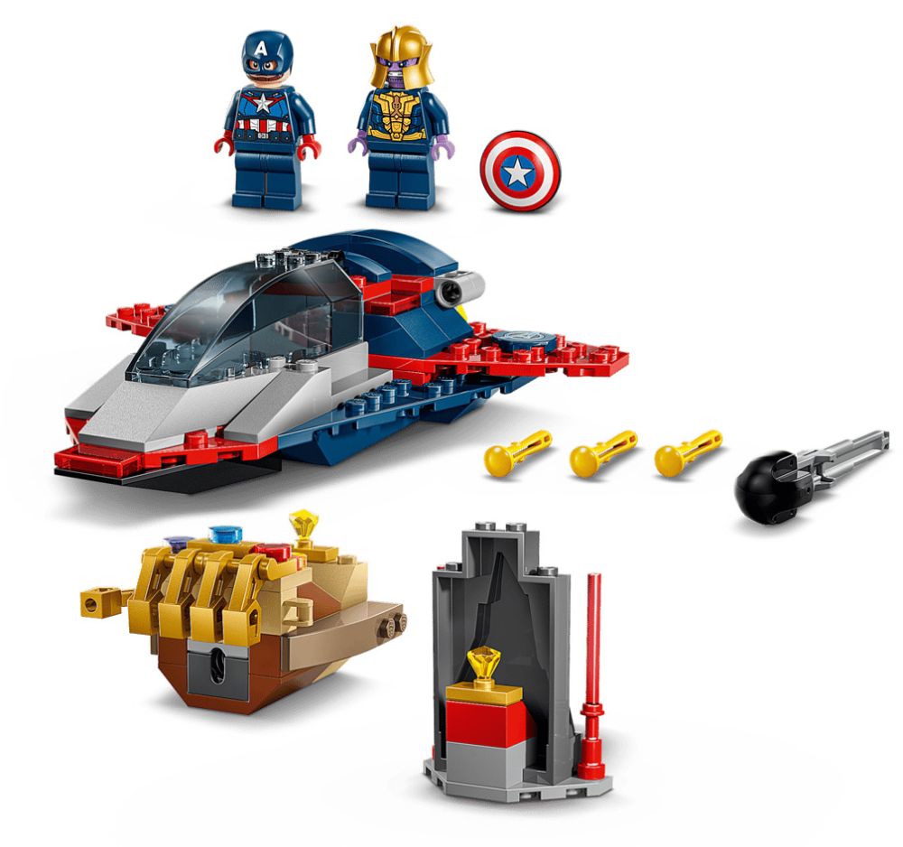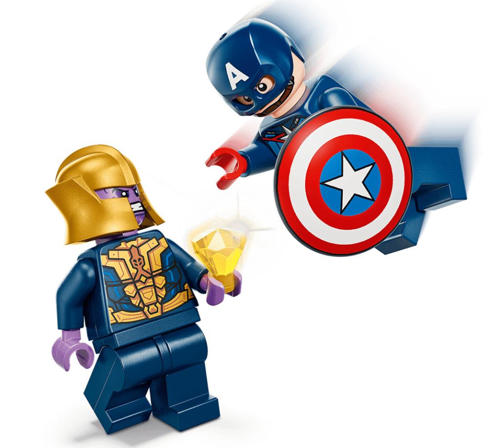 Le set de jeu comprend 2 minifigurines : Thanos dans un vaisseau qui ressemble au Gant de l’infini, avec des « doigts » articulés et un lance-missiles, et Captain America dans un Quinjet profilé avec 2 canons, un cockpit qui s’ouvre et une cachette pour son bouclier. Une construction séparée contient une pierre cosmique inspirant des jeux d’imagination, où Captain America tente d’empêcher Thanos de voler la précieuse pierre. Chaque sachet de briques inclut une grande brique de démarrage pour construire rapidement et jouer sans tarder. Un livret coloré fournit des instructions intuitives. Contient 107 pièces.