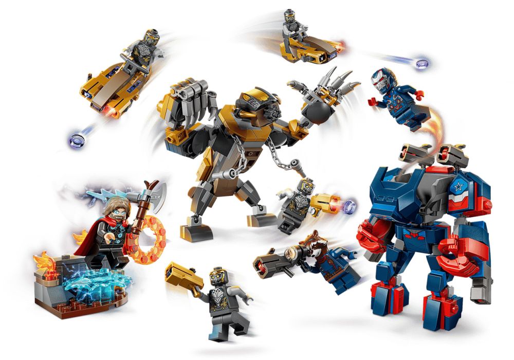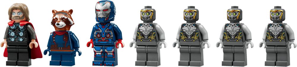- Minifigurines LEGO Marvel – Le set inclut 7 minifigurines : Iron Patriot MK2, Rocket avec un gros lance-tenons, Thor avec Stormbreaker et 4 Chitauri, dont 2 avec des lance-tenons dorés