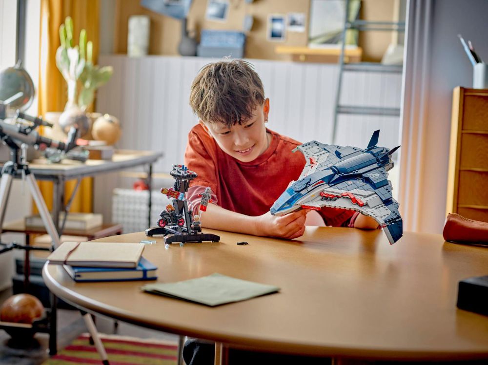 Cette réplique du Quinjet à construire inclut 5 minifigurines : Black Widow avec sa moto, Iron Man, Quicksilver, Ultimate Ultron et Hawkeye avec son arc et sa flèche. Les minifigurines peuvent être fixées sur différents endroits de l’avion, doté d’un cockpit qui s’ouvre, de 2 lance-tenons à l’avant et d’un espace de rangement pour les armes de Black Widow et l’arc d’Hawkeye. La porte arrière s’ouvre pour charger la moto. Un support pivotant amovible permet d’exposer cet avion mythique à 360°. Pour ajouter une expérience numérique, l’application LEGO Builder intuitive et ludique propose des outils de zoom, rotation 3D et suivi de la progression. Contient 1 131 pièces.