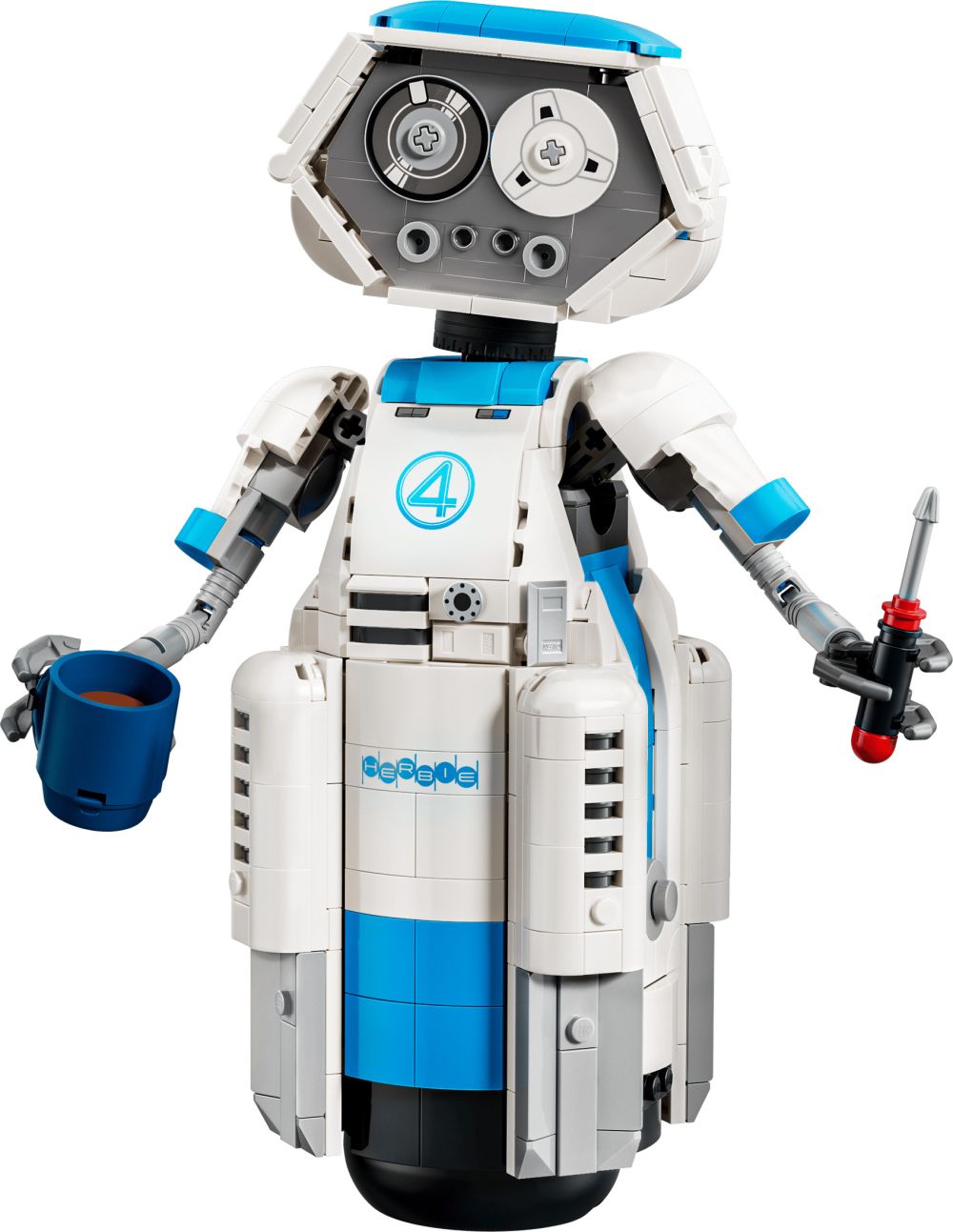 - ACCESSOIRES AMUSANTS – Retirez le panneau sur le torse du robot pour découvrir un espace de rangement dans lequel H.E.R.B.I.E. conserve une tasse et un tournevis, qu’il peut saisir dans ses mains