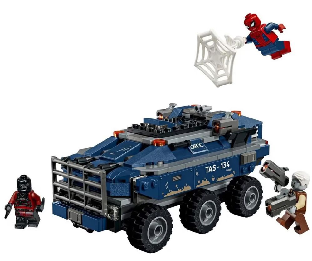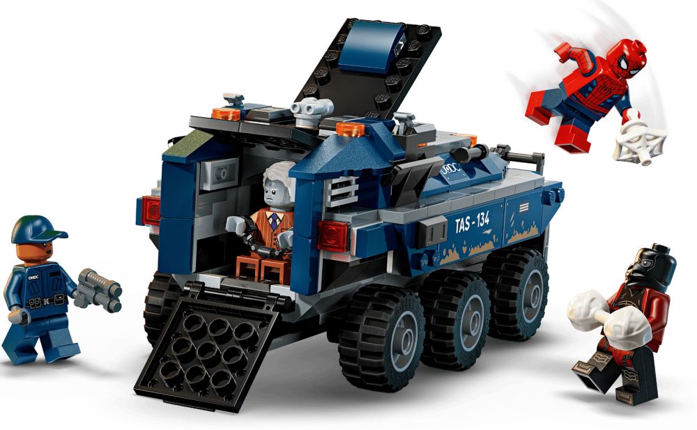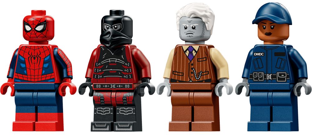- 4 MINIFIGURINES – Spider-Man a des toiles d’araignée qu’il peut tenir dans la main, Tombstone a 2 fusils à tenons, Tarantula a des pics sur les mains et les pieds, et le garde du DODC a des menottes et un fusil non fonctionnel