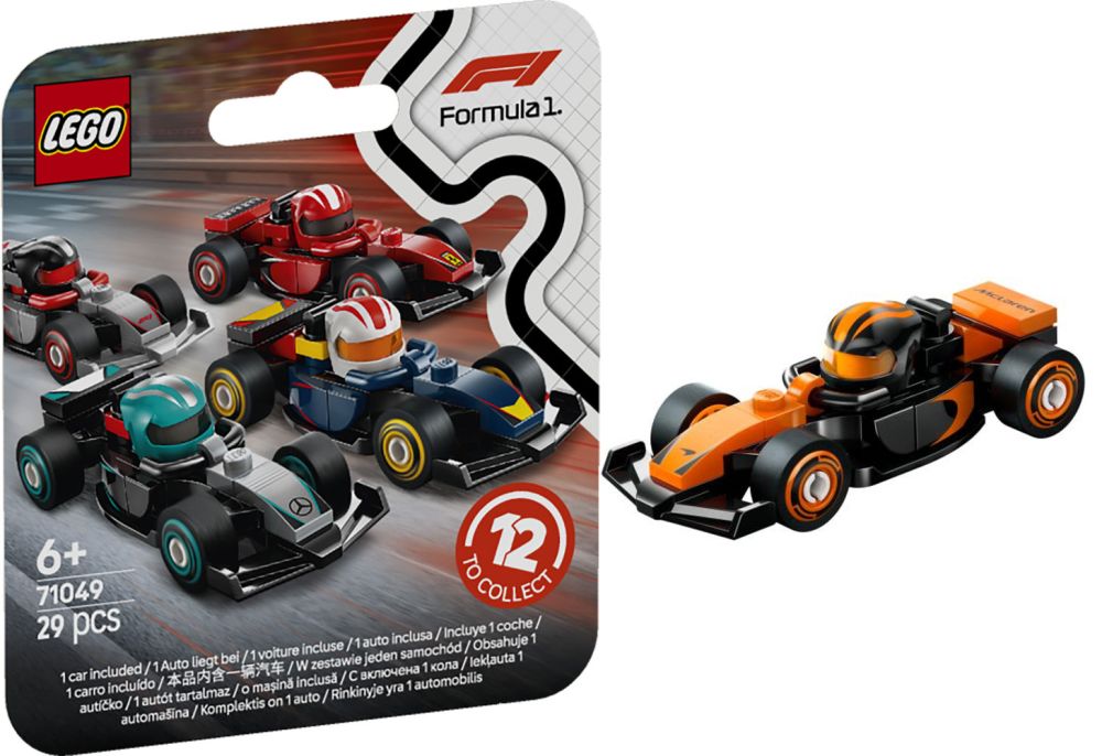 Chaque boîte surprise inclut 1 modèle de voiture LEGO F1 à collectionner sur un total de 12 disponibles : une voiture de F1, une voiture de F1 ACADEMY, ainsi que 10 voitures des écuries de Formule 1 (RB20, Mercedes-AMG, Ferrari, McLaren, Aston Martin, Alpine, Williams, VCARB, Sauber et Haas).