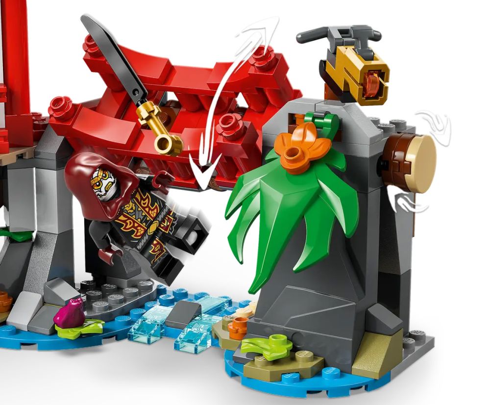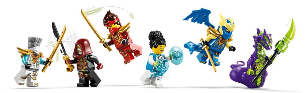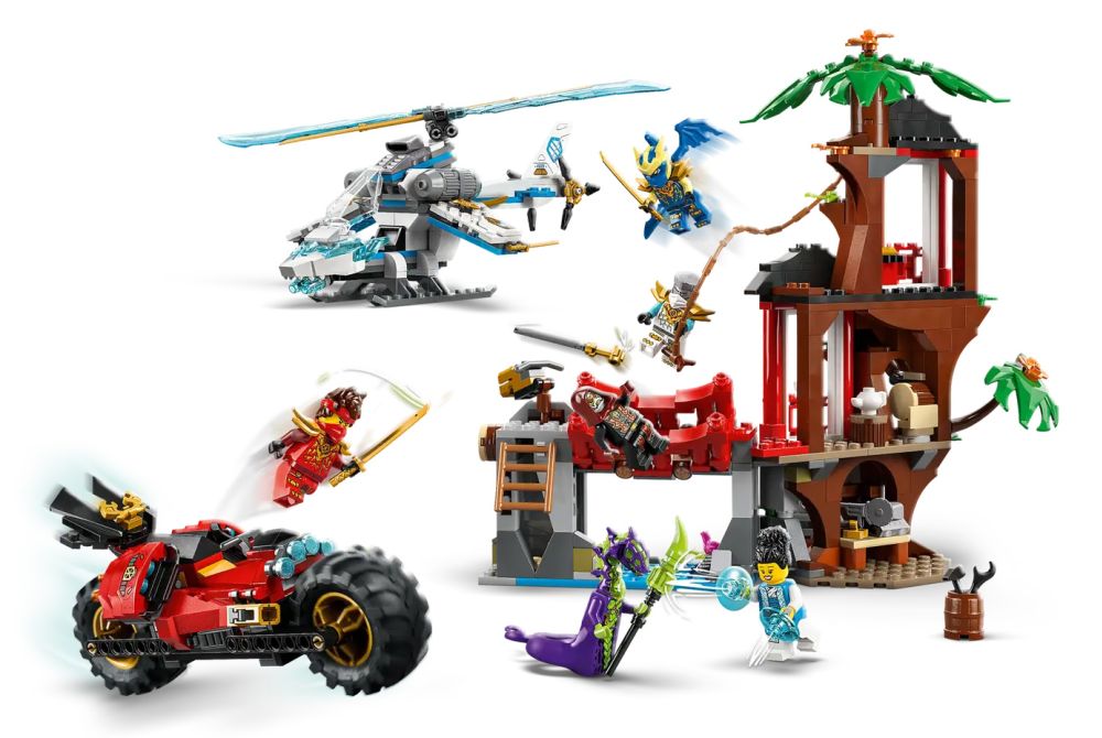 - 2 VÉHICULES NINJAS – La moto ninja a des roues mobiles, une selle sur laquelle une minifigurine peut prendre place et 2 fusils à tenons. L’hélicoptère possède un cockpit qui s’ouvre et des hélices qui tournent