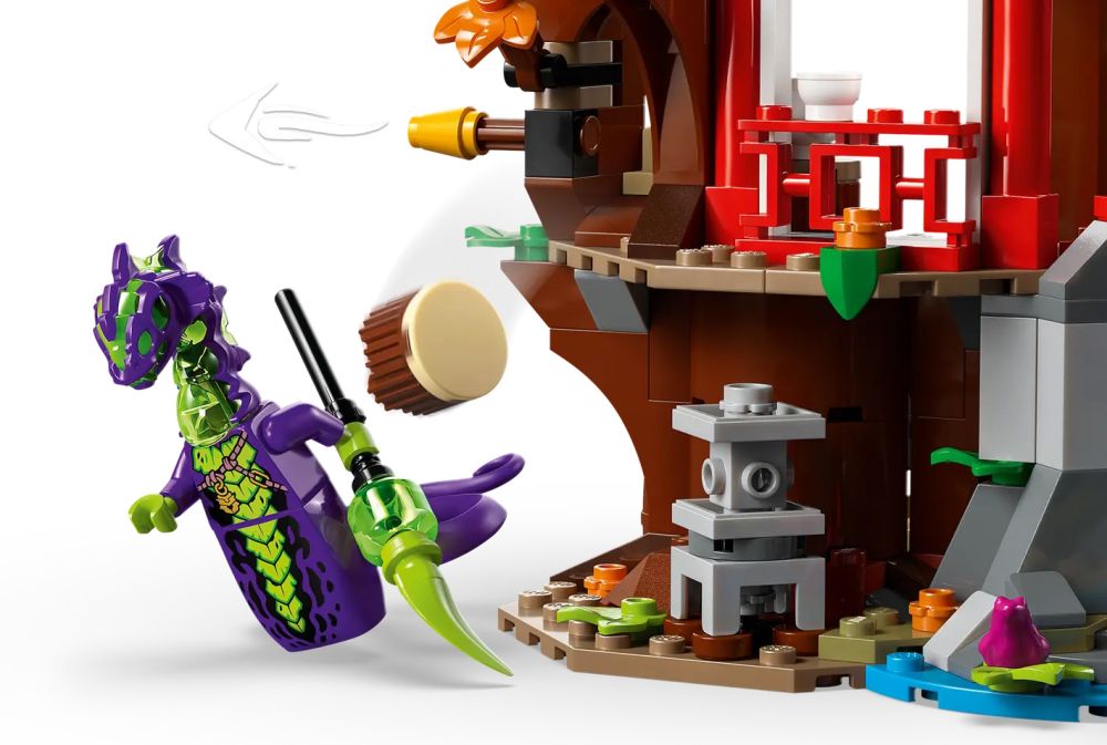 - CABANE DE NINJAS DANS L’ARBRE – La cabane à 3 niveaux inclut un atelier, un salon de thé, une terrasse, un piège qui libère un rocher, un pont pivotant, un fusil à tenons et une liane qui se balance