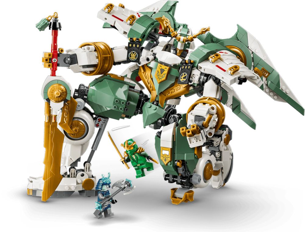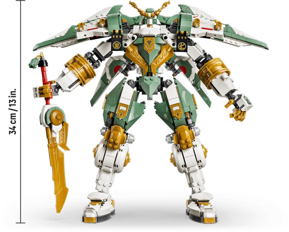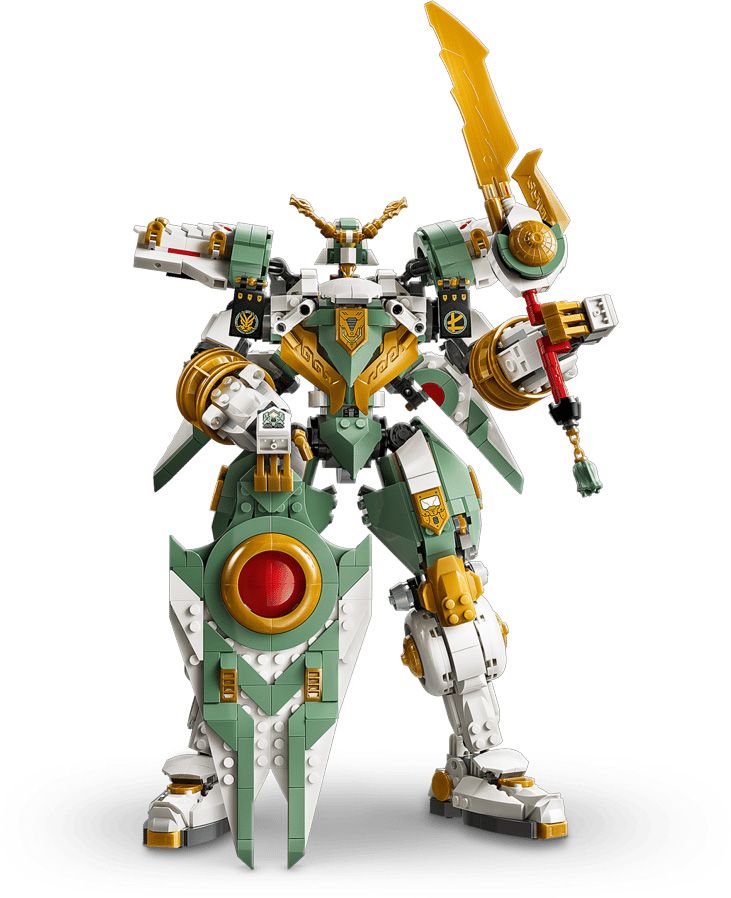 - SABRE ET BOUCLIER – Ce robot NINJAGO est équipé d’un sabre et, pour la première fois, d’un grand bouclier en briques qui peut se transformer et être placé dans le dos comme des ailes