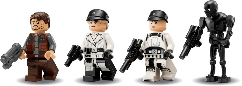 - 4 personnages LEGO Star Wars –Les minifigurines LEGO de Cassian Andor et Dedra Meero, chacune avec un pistolet blaster, la minifigurine LEGO d’un agent de l’ISB ainsi que la figurine LEGO du droïde K-2SO, chacune avec un blaster