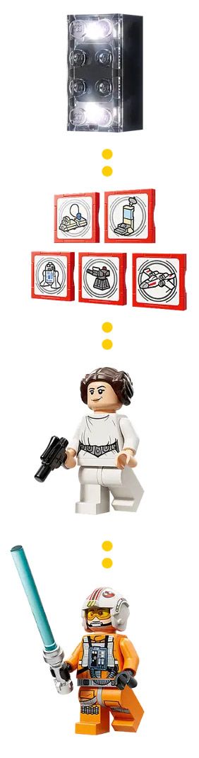 - 5 SMART TAGS – Les SMART Tags du X-Wing, de la tourelle impériale, du transporteur, du centre de commandement et de R2-D2 activent la SMART Brique et déclenchent des sons et lumières dynamiques selon la façon dont les enfants jouent et bougent