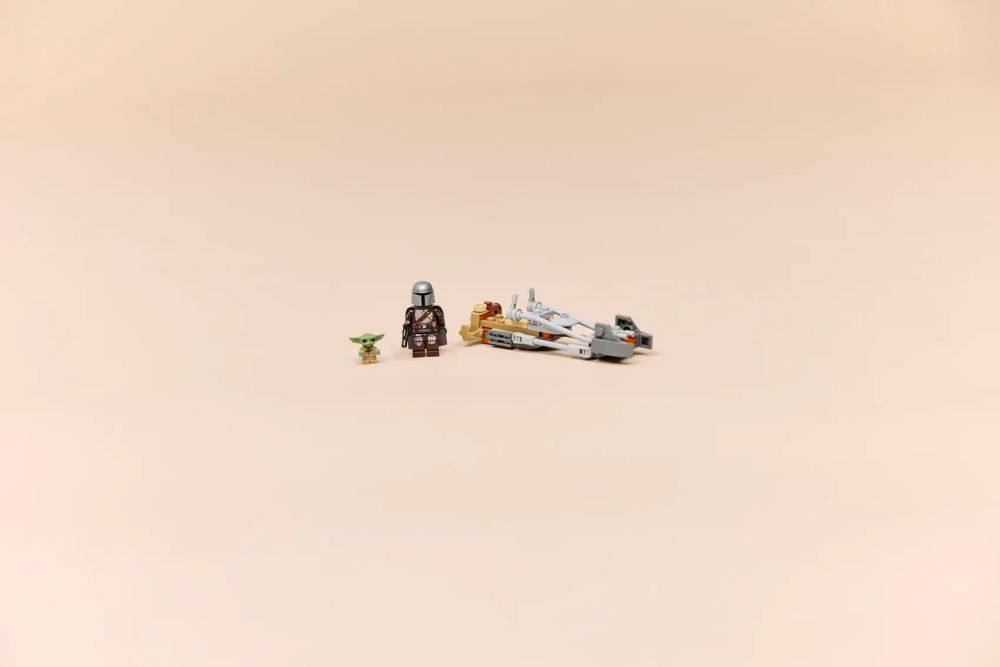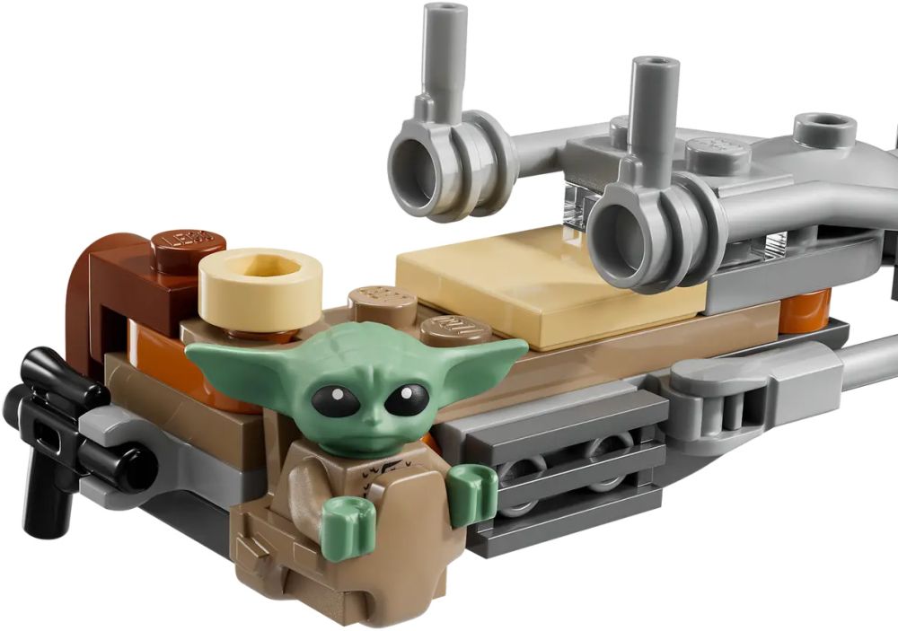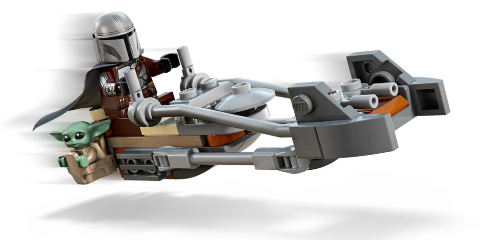 - SPEEDER BIKE – Fixez le fusil blaster du Mandalorien à l'arrière du speeder bike, puis installez la minifigurine sur le siège du conducteur avec Grogu à côté, dans la sacoche