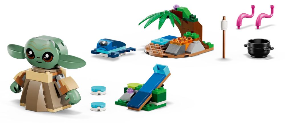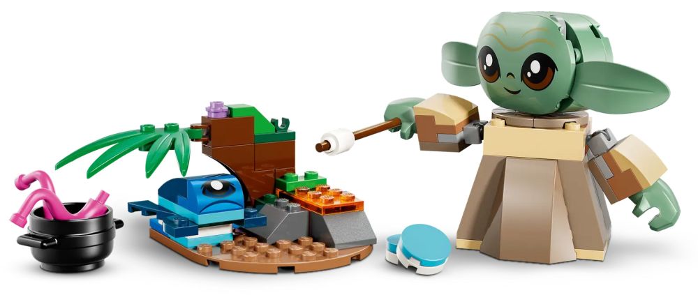 - ACCESSOIRES AMUSANTS – Construisez un foyer avec une marmite pour 2 tentacules, placez le bâton avec une guimauve dans la main de Grogu et trouvez l’un des 2 macarons bleus dans le ventre de Grogu