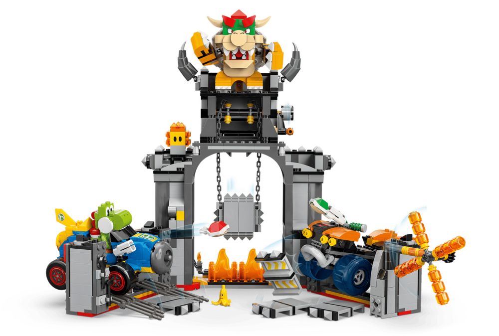 - Circuit de course LEGO Super Mario – Lancez des carapaces depuis le Quad standard ou le Proto 8, filez sur le circuit autour du château (ou à travers ses murs escamotables !), esquivez la barre de feu qui tourne et plus encore