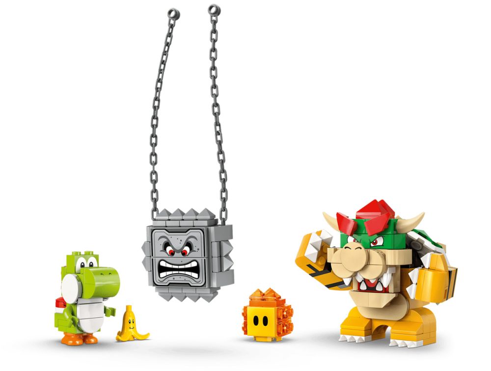 - 4 figurines LEGO Super Mario – Ce set LEGO Nintendo inclut des figurines de personnages (Bowser, Yoshi, un Thwomp et une Bulle de lave), ainsi qu’un élément banane avec un visage