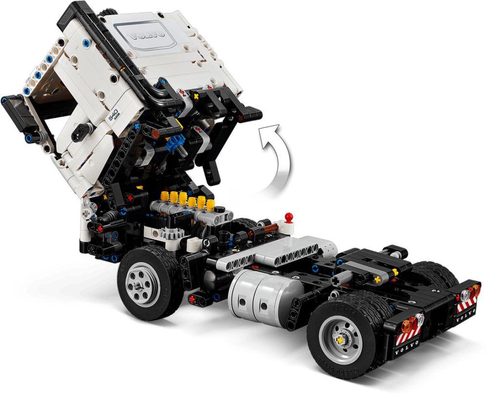 Les jeunes constructeurs peuvent ouvrir les portes du camion LEGO Technic et incliner la cabine de l’opérateur pour admirer le moteur V6 à pistons mobiles. Ils peuvent ensuite mettre le camion en position, détacher la remorque et déployer la rampe pour faire descendre la pelleteuse.