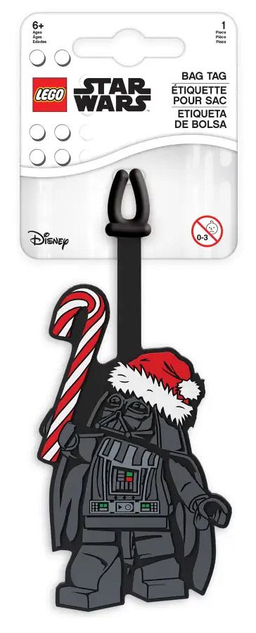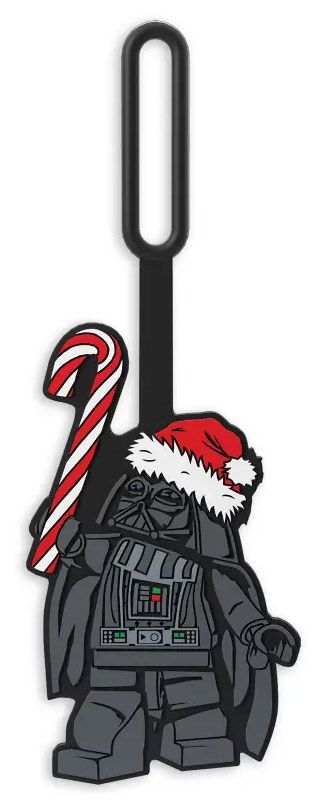 - Cette étiquette de sac LEGO Star Wars est réalisée en silicone souple et résistant et prend la forme d’une figurine de Dark Vador coiffée d’un chapeau de Père Noël et entourée de lumières de Noël.