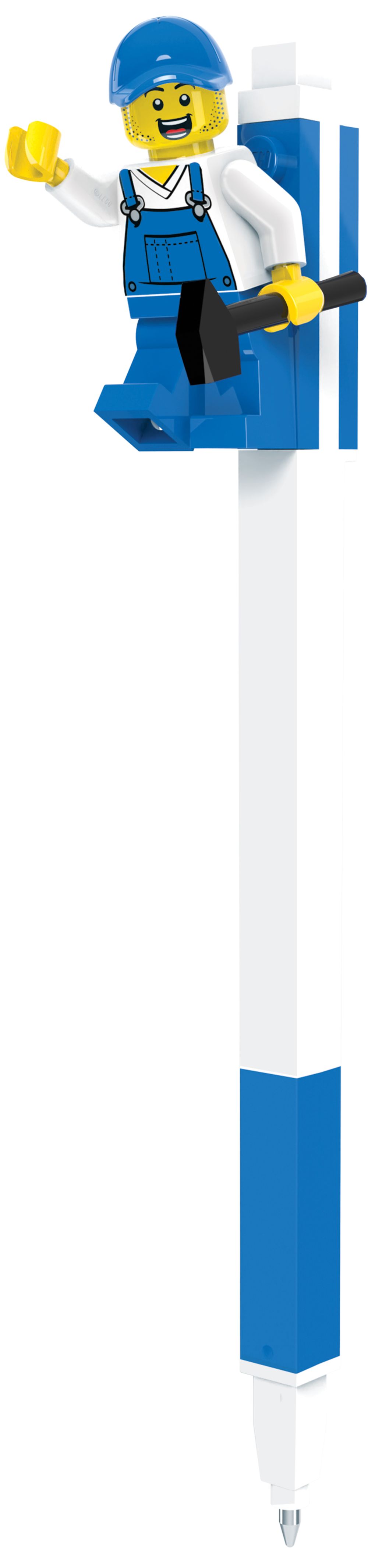 - 1 MINIFIGURINE – Le stylo s’accompagne d’une minifigurine d’ouvrier du bâtiment avec un casque bleu, un bleu de travail et un marteau, pouvant être fixée sur la brique LEGO intégrée