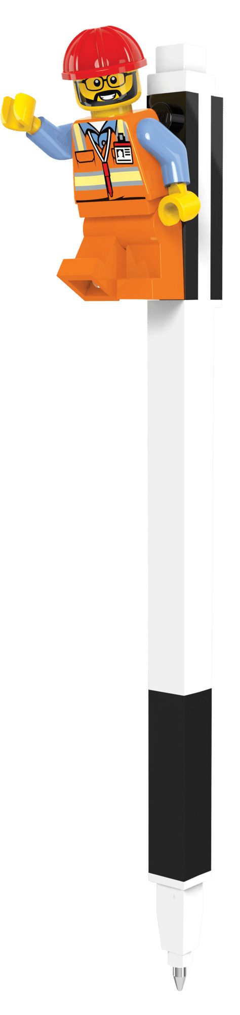 - 1 MINIFIGURINE – Le stylo s’accompagne d’une minifigurine d’ouvrier du bâtiment avec un casque rouge et des lunettes, pouvant être fixée sur la brique LEGO intégrée